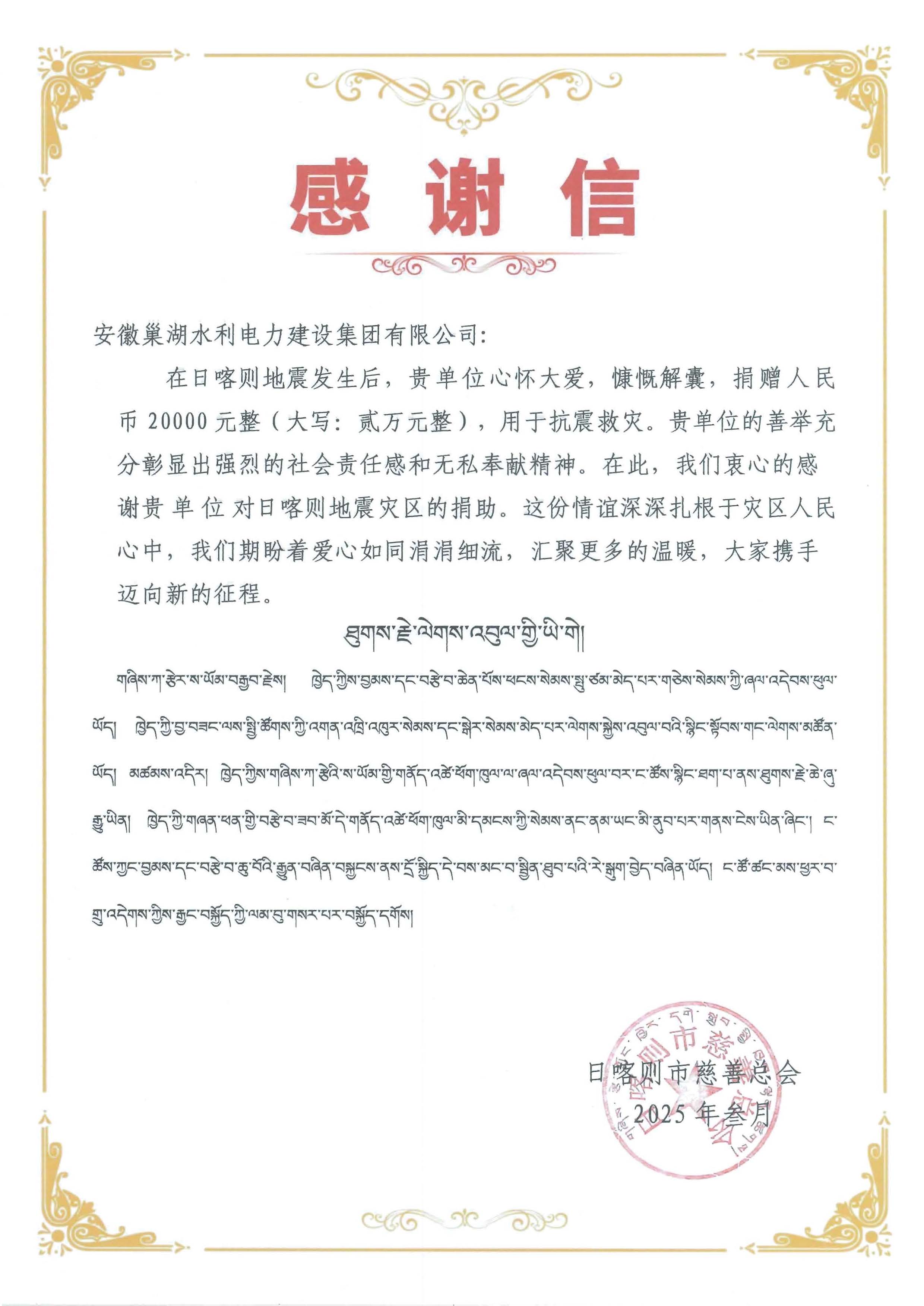 安徽巢湖水利電力建設(shè)集團有限公司為支援西藏日喀則地區(qū)抗震救災(zāi)工作,積極履行企業(yè)社會責任,我司向此次地震災(zāi)區(qū)捐贈人民幣貳萬元,用于受災(zāi)群眾生活保障、災(zāi)后重建及相關(guān)救援工作。